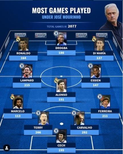 24直播网讯 今日,德转统计出了在穆帅手下出场次数最多的球员阵容。