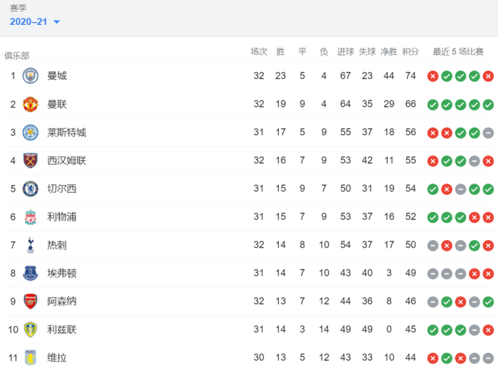 本轮过后,曼城32轮74分仍居第一,曼联32轮66分稳居第二,莱斯特城因参加足总杯半决赛而少赛一轮,以56分排名第三,西汉姆32轮55分排名第四。