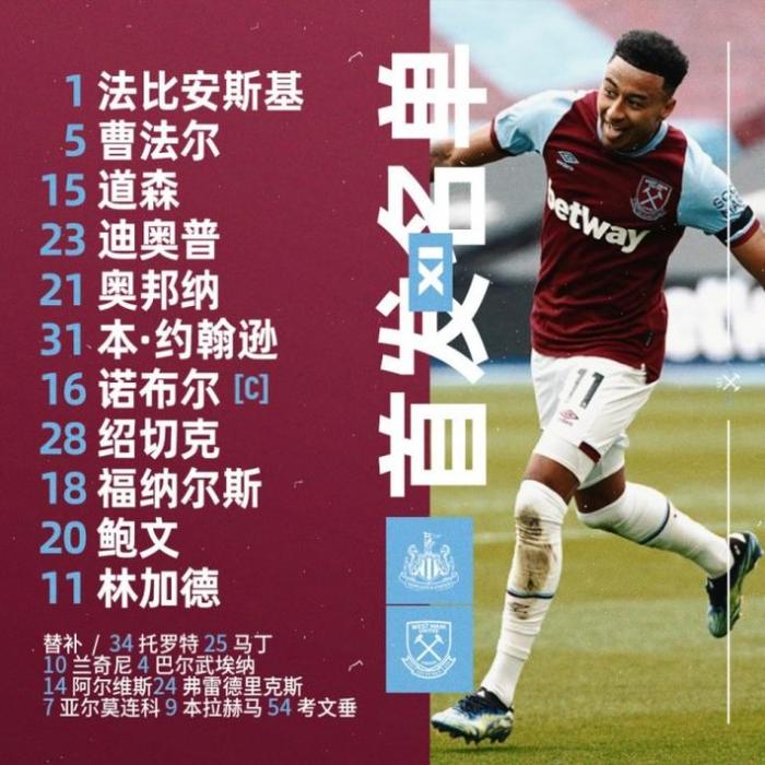西汉姆联vs纽卡斯尔首发: 林加德先发登场