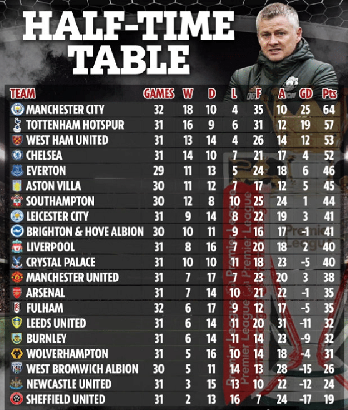 英超上半场积分榜:热刺第二,还有望争冠!曼联位居下半区!