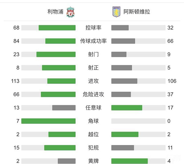 全场比赛结束,利物浦2-1战胜阿斯顿维拉,上升至积分榜第四位。