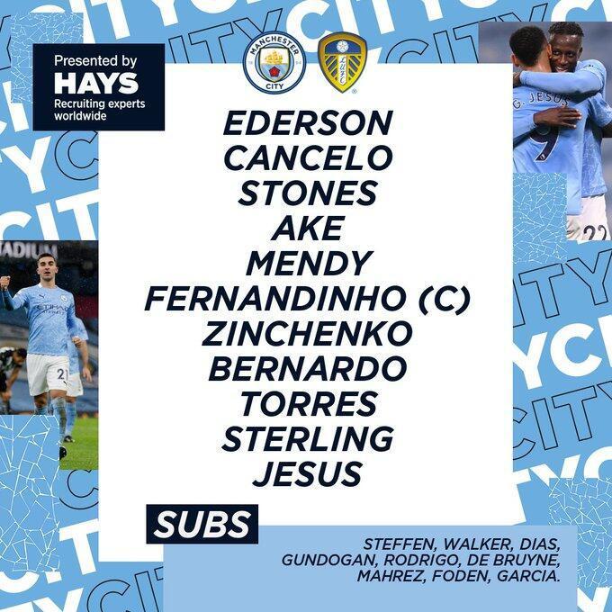 曼城vs利兹联首发:热苏斯领衔锋线 京多安德布劳内替补