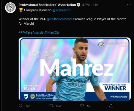 24直播网4月10日讯据PFA官方消息,曼城中场球员马赫雷斯当选英超3月最佳球员。