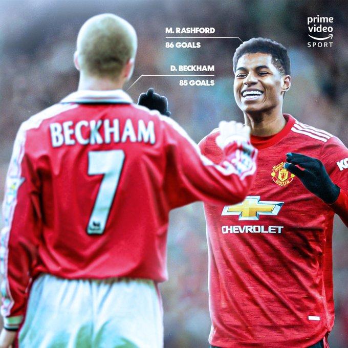 破门之后,拉什福德的曼联进球数也达到86粒,超越贝克汉姆的85球。