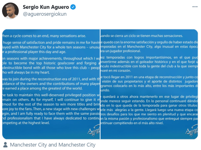 阿圭罗写道:“当一个阶段告一段落,你的心中会有许多情感出现。能为曼城效力整整十个赛季,让我非常满足和自豪,在现代职业运动员的生涯中,这种事情已经很不常见。”