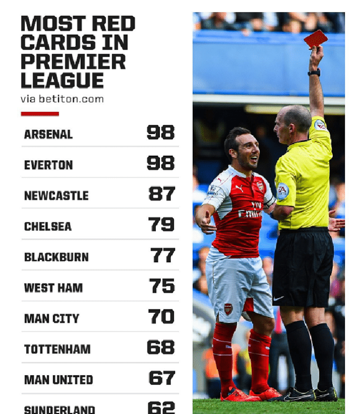 英超历史红牌榜:阿森纳埃弗顿并列第一!曼联仅排第九!