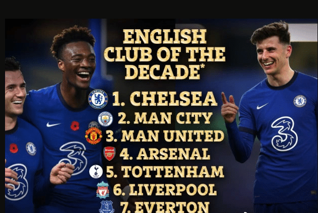 如图,IFFHS综合英超所有球队,最近十年来在欧冠、欧联、联赛、足总杯和联赛杯赛场上的表现给出了最终的排名。其中切尔西排名榜首,当然这个看起来不可思议,但是其实没啥争议。最近十年,切尔西拿到了1个欧冠冠军,2个欧联冠军,2个英超冠军,2个足总杯冠军和1个联赛杯冠军。从冠军奖杯来看,切尔西这个第一是实至名归的。