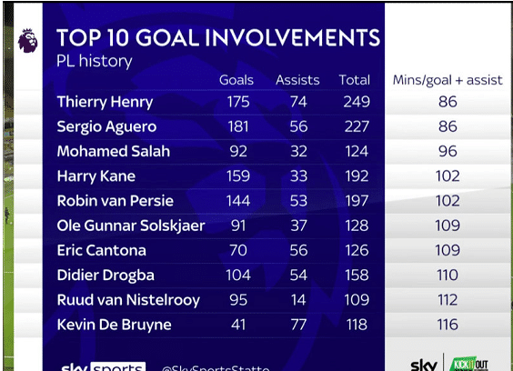 如图,亨利一共参加了256场英超比赛(只算联赛)打进175球助攻74次,一共制造了249球,而亨利平均86分钟就制造一粒进球,不得不说亨利真的是英超时代最好的攻击手。而和亨利并列第一的是阿奎罗,他在英超赛场上打进181球助攻56次,一共制造227球,他也是平均86分钟制造1球。不过因为制造进球总数比亨利少,所以只能排名第二。