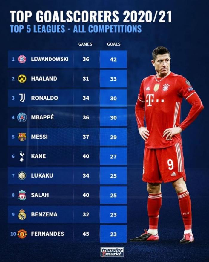 24直播网讯北京时间3月27日,转会市场统计了目前欧洲五大联赛球员的俱乐部赛事进球榜。前五位分别为莱万、哈兰德、C罗、姆巴佩和梅西。
