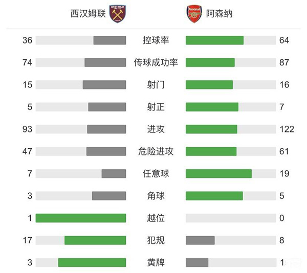 全场比赛结束,阿森纳3-3战平西汉姆联。