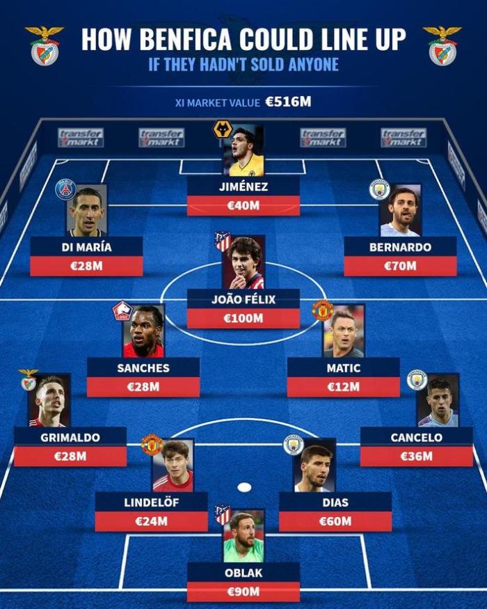 24直播网3月14日讯 转会市场网本周列出了效力过本菲卡的现役球员最佳阵,奥布拉克、菲利克斯、贝尔纳多-席尔瓦等人入选,11名球员当前的总身价高达5.16亿欧元。