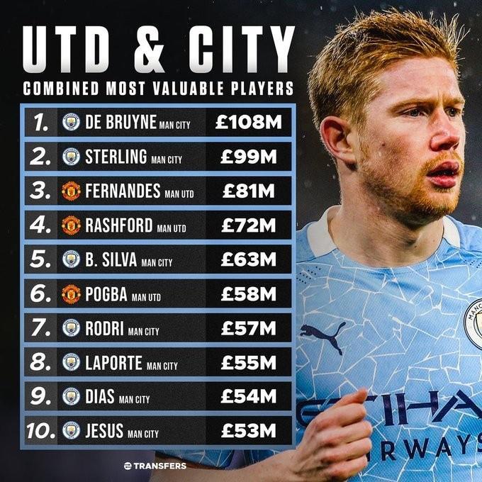 来源:24直播网03-07 19:0524直播网3月7日讯北京时间3月8日凌晨,英超第27轮迎来曼市德比。推特主“Football Transfers”盘点了双方阵中身价最高的10位球员,其中曼城7人入选,曼联3将上榜。德布劳内身价1.08亿镑居首,斯特林9900万镑次席,B费8100万镑排第三。