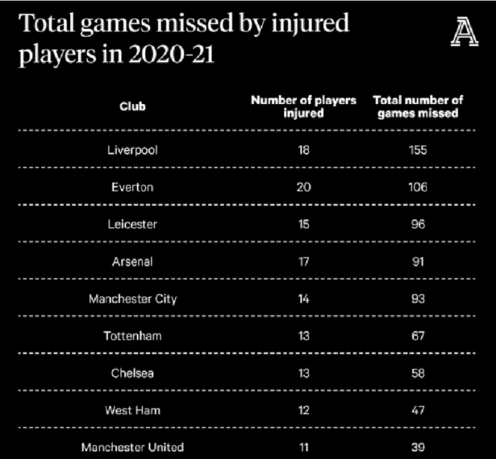 本赛季英超伤病情况汇总:利物浦18人受伤,错过155场比赛!