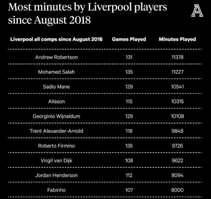 此外,该媒体还统计了2018年8月至今,利物浦球员的出场次数和时间。左边后卫罗伯逊出场131场排在第2,但是出场时间11378分钟排在第1。萨拉赫则是135次出场排在第1,出场时间11227分钟排在第2,这两名球员堪称红军铁人。