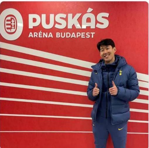 赛后,2020年普斯卡什奖得主孙兴慜在普斯卡什球场合影留念。