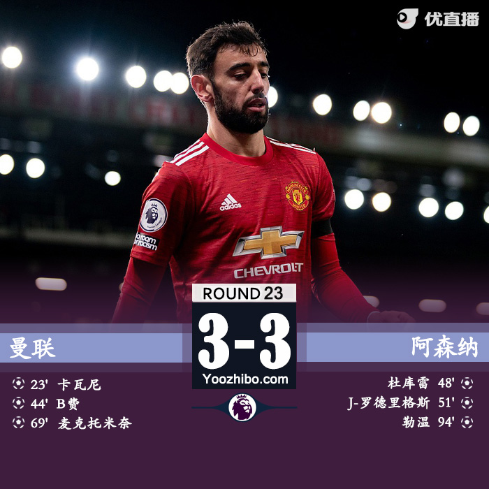 随后全场比赛结束,曼联在主场3-3遭埃弗顿补时绝平。