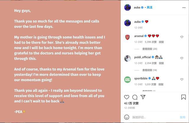 奥巴梅扬写道:“大家好,非常感谢大家这几天的来电和信息。我的母亲正在经历一些健康问题,我必须在她身边陪伴她。她现在已经好多了,我今晚就会回家,我非常感激医生和护士们帮助她度过这个难关。”