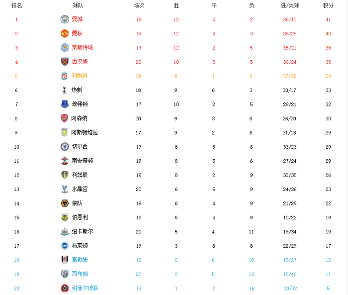 近期利物浦的表现让克洛普压力陡增,他们也已经跌出前四,不过距离榜首的曼城7分,依旧有机会。现在曼城以19战41分领跑。身后是40分的曼联、38分的莱斯特城和多赛一场35分的西汉姆联,铁锤帮绝对是最大的黑马,这支伦敦球队已经拿到了10场胜利,比利物浦和热刺都要多,如果可以在强强对话中取得胜利的话,他们是很有希望搅翻争冠格局的。