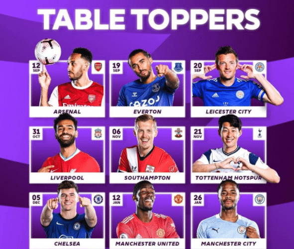 本赛季英超一共有9支球队在比赛日之后登上英超积分榜第一的位置,分别是阿森纳、利物浦、曼联、曼城、埃弗顿、热刺、莱斯特城、南安普顿和切尔西。这也直接追平了1986-87赛季的纪录,当时也是有9支球队曾经在积分榜上领跑。