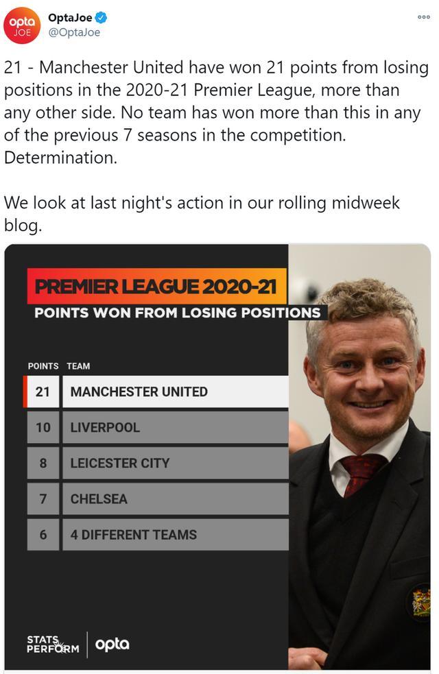 上轮联赛,曼联客场2-1逆转击败富勒姆。据统计,本赛季至今红魔在联赛中先丢球的情况下已拿到21分,过去7个赛季里,英超没有任何球队能够在先落后时拿到这么多分。