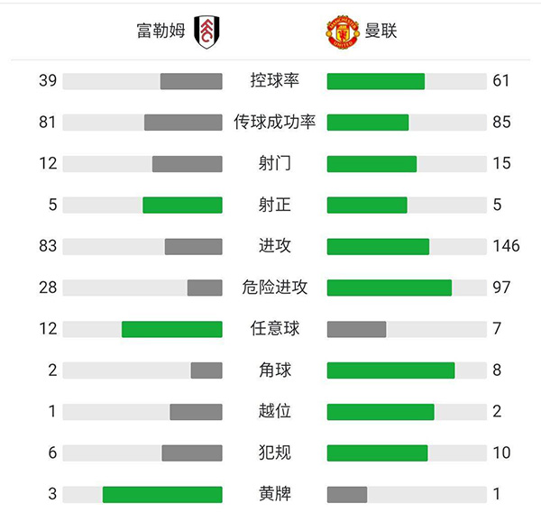全场比赛结束,曼联客场2-1逆转富勒姆。