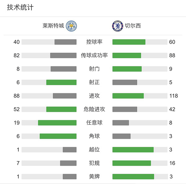 全场比赛结束,莱斯特城2-0切尔西。