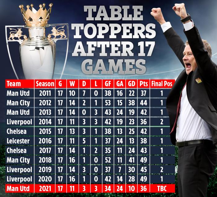 但有另一项数据值得曼联警惕,曼联17轮积分36分的成绩,也是过去10个赛季领头羊的最低得分数字。这分数与2013/14赛季的利物浦相同,而上面提到过,那个赛季拥有苏亚雷斯和斯图里奇的红军,最终排名第二。
