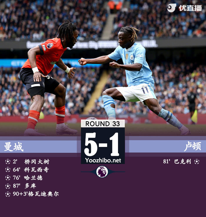 2分优势登顶!曼城5-1卢顿 哈兰德点射+造乌龙 多库惊艳一条龙