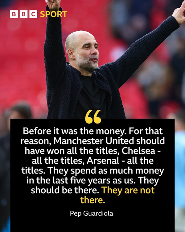 曼城成功仅靠钱?瓜帅驳斥:若如此曼联切尔西阿森纳应包揽冠