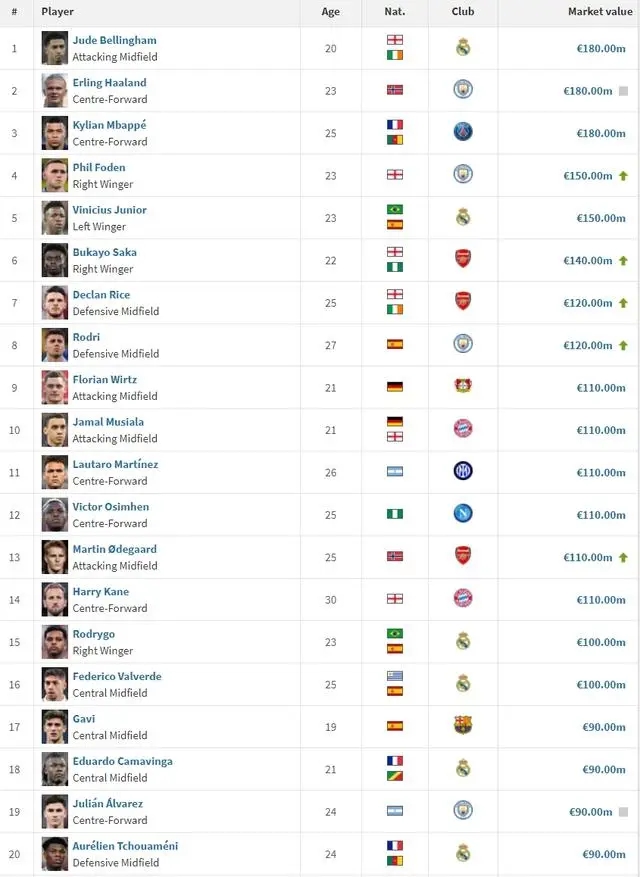 24直播网讯 德转英超身价前10公布,哈兰德1.8亿欧领跑,福登1.5亿欧排在第二。