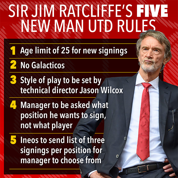 英媒《太阳报》披露,拉爵对主帅提出了五个严格限制:1、新援年龄低于25岁;2、不买巨星;3、由技术总监威尔考克斯决定球队风格;4、主帅只能对引援位置提出要求,无权指定球员;5、英力士会在每个买人位置上圈定三人候选名单,供主帅选择。