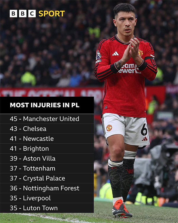 滕哈格本赛季一直坚持前所未有的伤病危机是曼联英超排名沦落到第8位的主要原因之一。几乎每一个被认为是他理想的首发球员,都经历过伤停。数据显示,只有门将安德烈·奥纳纳、右边卫迪奥古·达洛和边锋亚历杭德罗·加纳乔整个赛季没有任何伤病,甚至「铁人」布鲁诺·费尔南德斯都首次因伤高挂免战牌。