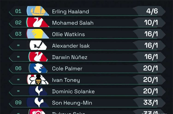 哈兰德在上个赛季就展现出了令人惊叹的进球能力,他的身体素质、门前嗅觉和把握机会的能力都堪称顶级。在曼城强大的中场支持下,他如鱼得水,不断地用进球摧毁对手的防线。新赛季,曼城的阵容依然强大,哈兰德无疑将继续成为球队进攻的核心箭头。他的超低赔率也反映出市场对他延续出色表现的强烈信心,他被广泛看好能够再次在英超赛场上大杀四方,成为金靴的最有力竞争者。