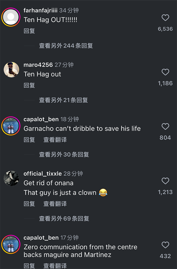 不少曼联球迷气愤留言道:“这场失利100%归咎于教练!”:“在我们解雇教练之前,不会再次有机会进入前4了!”:“令人沮丧,不得不承认,我们需要更好的球员和教练!”;“管理层真的应该后悔与滕哈格续约的决定!”还有球迷再次吐槽滕哈格狂买旧将的争议行为:“这就是当你雇用20名前阿贾克斯球员时,会发生的情况!”