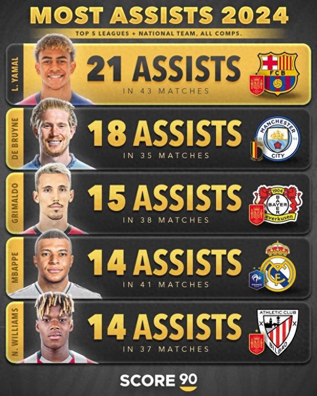 亚马尔闪耀!2024 年五大联赛 + 国家队助攻榜居首