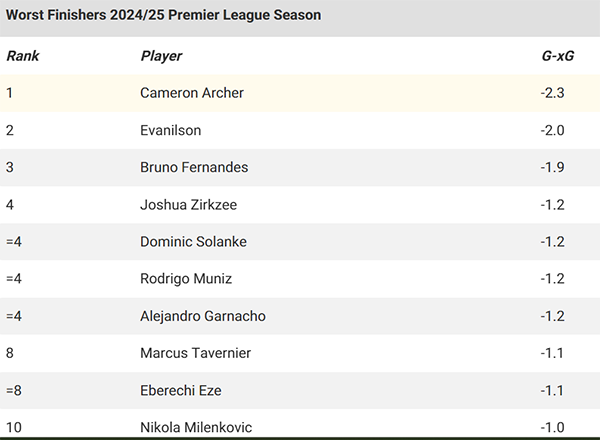 曼联队长B费的进球数比预期进球少了1.9球,排名英超第三;齐尔克泽和加纳乔紧随其后,以-1.2球的数据与热刺标王索兰克等人并列第四。射门最差Top10排名中,只有曼联和伯恩茅斯有超过一人上榜,仅有红魔独占3人!