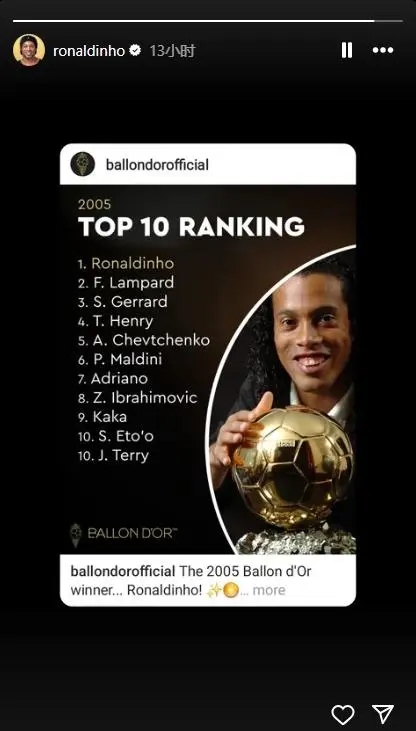 24直播网讯 小罗晒自己2005年获得金球奖时的前10榜单,什么水平?