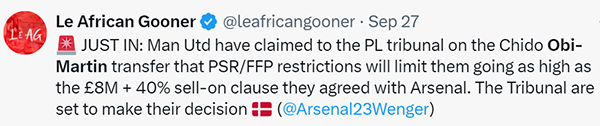 据称,曼联将为希多奇·奥比-马丁向阿森纳支付800万英镑转会费,外加40%的二次转会分成条款。在英超委员会的听证会上,曼联表示受限于英超PSR盈利与可持续性规则和欧足联FFP财政公平竞赛规则,不能给出更多费用。曼联在当地时间周五早上11点接到了英超官方的电邮,通知他们可以为这名球员注册。