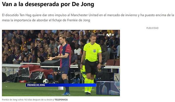 德容在2019年夏窗加盟了自己从小支持的巴萨,球队前主帅哈维也赞扬他是非凡的球员,非常适合传控足球打法。因此自2022年滕哈格执教以来,一直有传言称德容将转会曼联。尤其在2022年夏季,曼联甚至与巴萨就6500万欧元+2000万欧元浮动的转会费达成了协议,可惜德容心向诺坎普,以及巴萨拖欠的高额工资,最终拒绝转会。