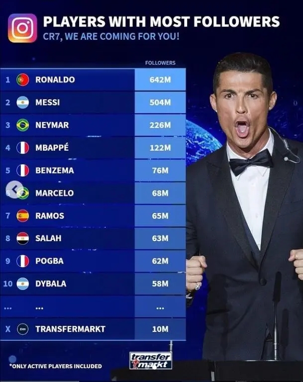 你的位置: 24直播网 足球直播 英超 德转统计现役球员 ins 粉丝数,C 罗、梅西居前二,内马尔排第三