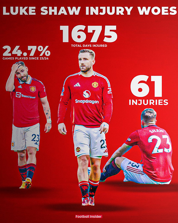 其他数据表明,卢克·肖在曼联大大小小受伤61次,2023/24赛季至今的出勤率只有24.7%。他的伤病源头并非当年欧冠的断腿,更多是因为对自己的身体照顾不够周全,许多时候体重过大,给关节、韧带和肌肉负荷过大所致。