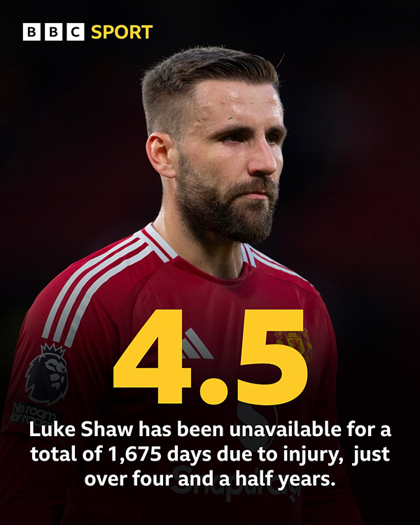 BBC英国广播公司公布的一项数据显示,已经效力俱乐部接近10年的卢克·肖,只有1675天没有受到伤病困扰,相当于4.5年,其余5年多他都拿着曼联的高薪在养伤。这包括过去这一年,卢克·肖在英格兰队的参赛时间比曼联更多,他打封闭参加了欧洲杯决赛。