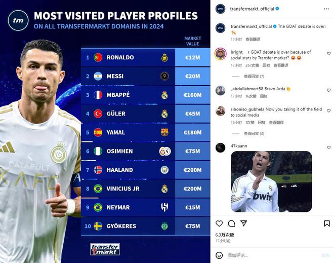 24直播网讯德转发布2024年度德转全平台球员资料页浏览量排行,C罗力压梅西登顶。德转配文:“GOAT之争结束了!”