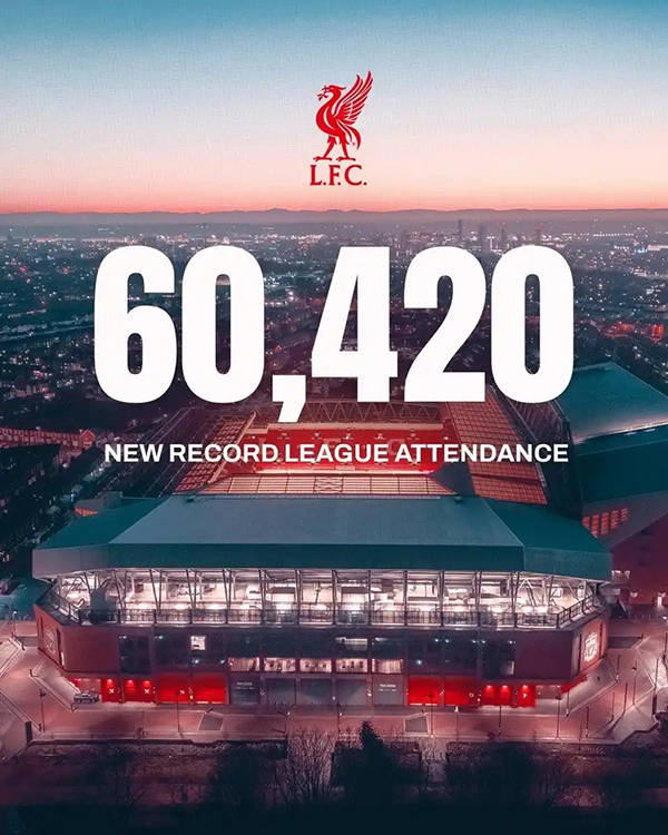 利物浦本轮联赛主场大胜伊普斯维奇,共有60420名观众现场观看本场比赛,这也是安菲尔德球场的联赛上座人数纪录。
