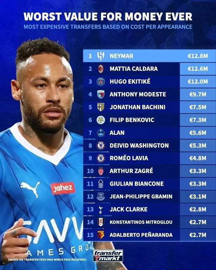 德转曝光球员场均出场花费排行,内马尔凭啥称霸榜首?