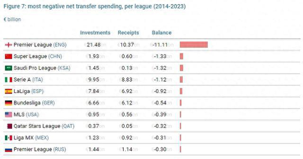 据足球统计机构CIES计算,在2014-2023期间,英超以111.1亿欧的净支出排名世界第一,而中超和沙特联分列2、3。