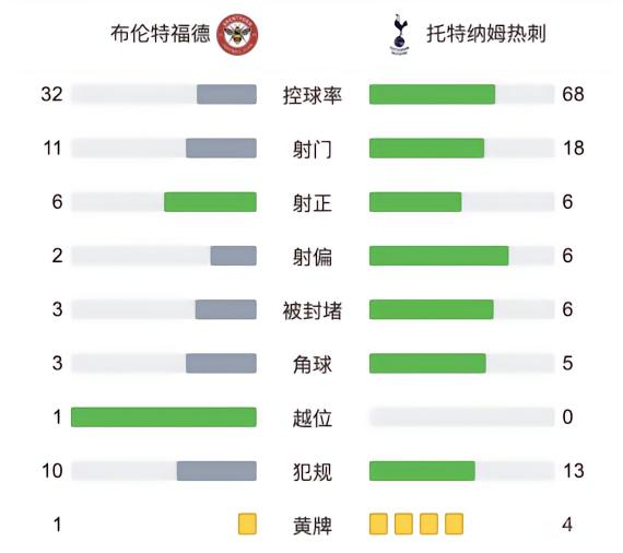 全场比赛结束,热刺2-2战平布伦特福德。