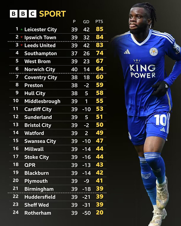 此役获胜后,莱斯特城终于止住了近期的颓势。此前6轮英冠,莱斯特城仅仅只拿到4分,这也让他们在积分榜上的优势荡然无存,甚至被拉下了榜首位置。而凭借本场关键的3分,莱斯特城39轮后积85分,暂时回到榜首,领先第2名伊普斯维奇1分,比第3名利兹联则多出了2分。