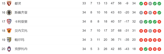 目前,帕尔马34轮积20分排名意甲积分榜第19位,在联赛还剩4轮的情况下,他们落后降级区外的卡利亚里12分,确定保级失败。