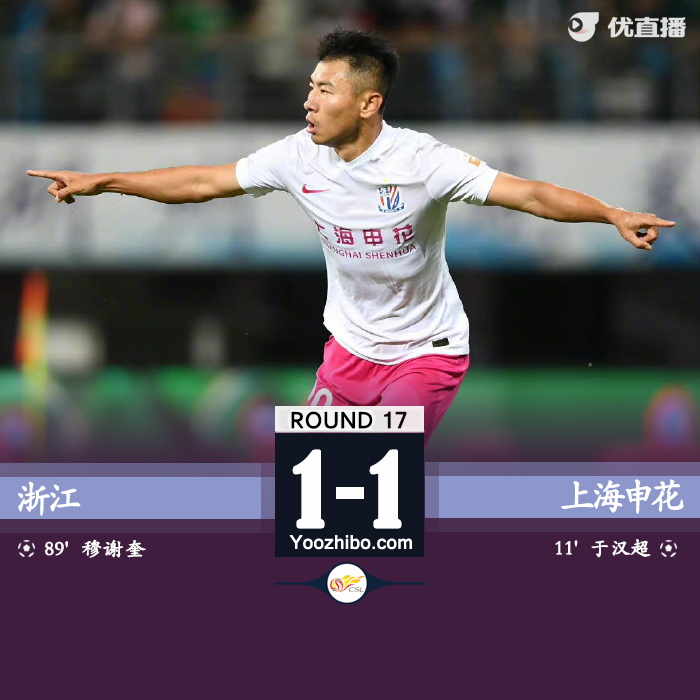 24直播网9月10日讯 北京时间9月10日19:30,中超第17轮,浙江队迎战上海申花。上半场,吴曦助攻于汉超先下一城,浙江队屡失良机!下半场,曹赟定送点,穆谢奎主罚命中扳平比分!全场比赛结束,浙江队1-1上海申花!